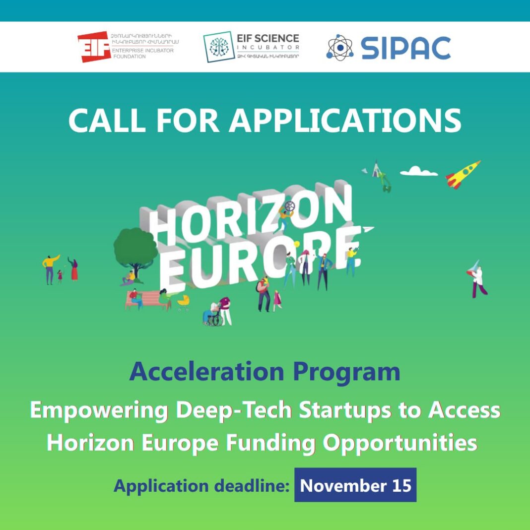 «Ձեռնարկությունների ինկուբատոր» հիմնադրամը (EIF) ԳԳիտական և նորարարական գործընկերությանն աջակցման կենտրոնի (SIPAC) հետ համագործակցությամբ և իր Գիտական ինկուբատորի ներքո մեկնարկում է հատուկ մշակված աքսելերացիոն ծրագիր՝ աջակցելու deep-tech ստարտափներին՝ Horizon Europe-ի կարևոր դրամաշնորհային մրցույթներին հաջողությամբ դիմելու գործընթացում։