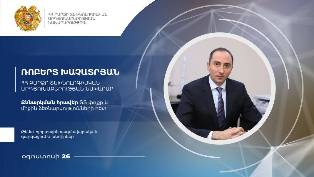ՀՀ բարձր տեխնոլոգիական արդյունաբերության նախարար Ռոբերտ Խաչատրյանը օգոստոսի 26-ին հանդիպում կունենա ՏՏ ոլորտի փոքր և միջին ձեռնարկությունների ղեկավարների հետ, հաղորդում է նախարարության մամուլի ծառայությունը: