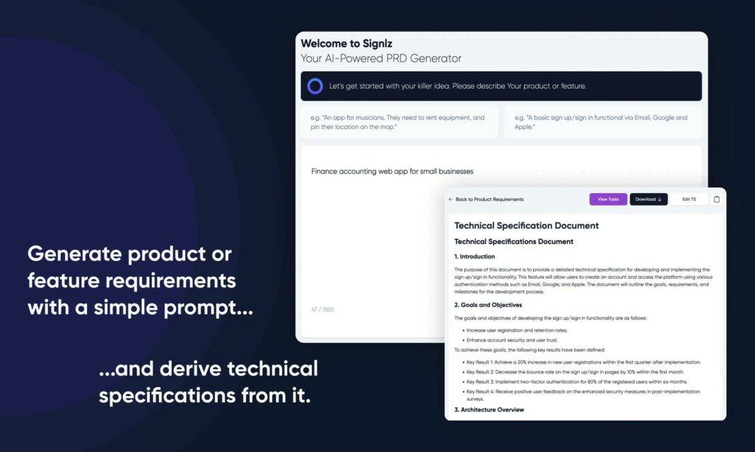 Signlz-ը պրոդուկտ մենեջերների կյանքը հեշտացնող գործիք է: Ձեռքով արվող ողջ փաստաթղթավորումը այս հարթակի օգնությամբ ավտոմատացվում է: Արհեստական բանականության օգնությամբ SignIz-ը ստեղծում է բոլոր անհրաժեշտ փաստաթղթերն ու տեխնիկական բնութագրերը՝ վերածելով դրանք առաջադրանքների, պատմությունների և այլն: Առաջադրանքների կառավարման համակարգն էլ օգնում է կենտրոնանալ ռազմավարության ստեղծման վրա: