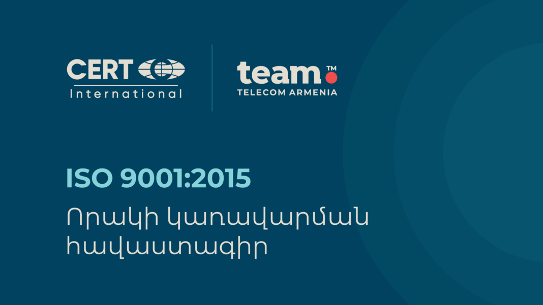 Team Telecom Armenia-ն արժանացել է ISO 9001:2015 միջազգային հեղինակավոր հավաստագրի որակի կառավարման ոլորտում բարձր չափանիշներ ապահովելու համար: Այս հավաստագիրը Team-ը ստացել է Եվրոպական Cert International միջազգային ճանաչում ունեցող սերտիֆիկացնող ընկերության կողմից:
